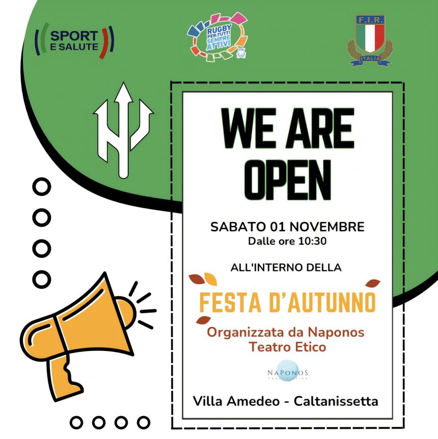 Alla “Festa D’autunno” a Villa Amedeo, sabato 1 novembre dalle ore 10.30, importante appuntamento da non mancare con “la festa del rugby” della Nissa Rugby. La società della palla ovale del presidente Giuseppe Lo Celso organizza una kermesse, per la promozione e lo sviluppo di questo sport con l’ausilio di tecnici federali per l’occasione presenti nel capoluogo nisseno: evento promosso da “Sport e Salute”.