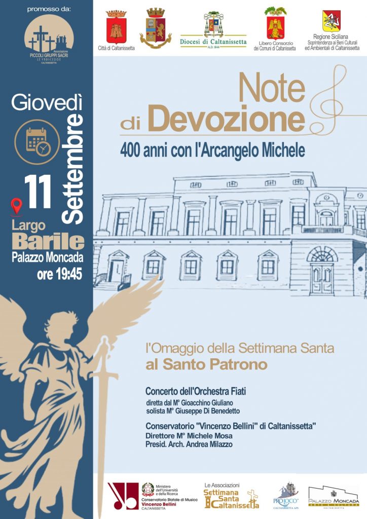 La sera di giovedì 11 settembre, alle 19,45, nello spazio magico di largo Barile, recentemente ristrutturato davanti al secentesco palazzo Moncada, “Note di devozione – 400 anni con l’Arcangelo Michele“: una serata unica, in un suggestivo palcoscenico a cielo aperto, che qualificherà il Settembre nisseno con un evento in cui musica, devozione e narrazione poetica si intrecceranno a ricomporre il mosaico identitario in cui la Città si è identificata nei secoli.
