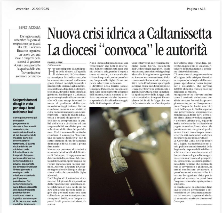 Rassegna stampaNuova crisi idrica a Caltanissetta La diocesi “convoca” le autorità Ultimo aggiornamento: Settembre 21, 2025 8:52 am redazione 115 Views Condividere 0 Min Leggere CONDIVIDERE Avvenire Domenica 21 settembre 2025 TAGGED:andrea gallèFABIO CORVOgiuseppe paruzzomarcello frangiamoneMONS. MARIO RUSSOTTOPaolo Mozzicato Condividi Questo Articolo Facebook Twitter Whatsapp Whatsapp Copy Link Print