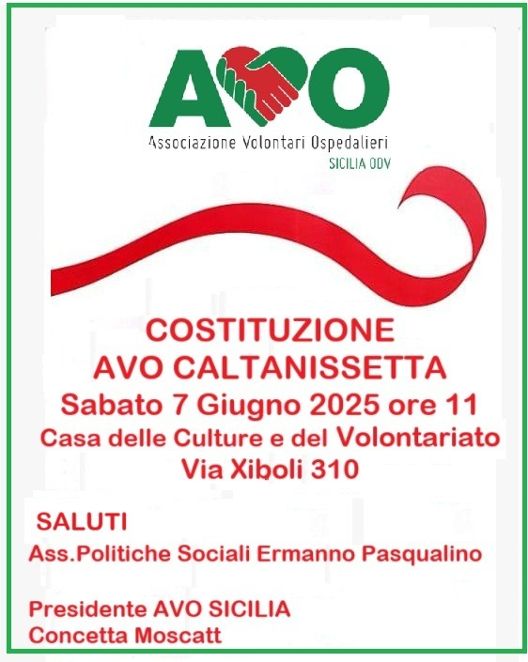 Durante la cerimonia, sarà firmato lo statuto e l’atto costitutivo della sede, alla presenza della presidente regionale Avo Sicilia Concetta Moscatt e dell’assessore alle politiche sociali del Comune di Caltanissetta Ermanno Pasqualino.