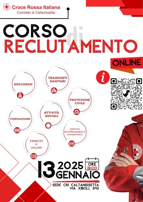 Aperta la nuova campagna reclutamento per volontari della Croce Rossa Italiana di Caltanissetta. Il consiglio direttivo, presieduto da Santina Sonia Bognanni, in esecuzione del Piano Formativo anno 2025 approvato nella seduta del Consiglio Direttivo del 05 Dicembre 2024 ha attivato un nuovo corso per Volontari della Croce Rossa Italiana. Il corso sarà svolto in modalità OnLine e sarà rivolto a tutti coloro i quali abbiano voglia di mettere in gioco le proprie risorse a favore dei vulnerabili ma che siano motivate a sposare l’idea dei Sette Principi Fondamentali, cardini statutari della Croce Rossa.