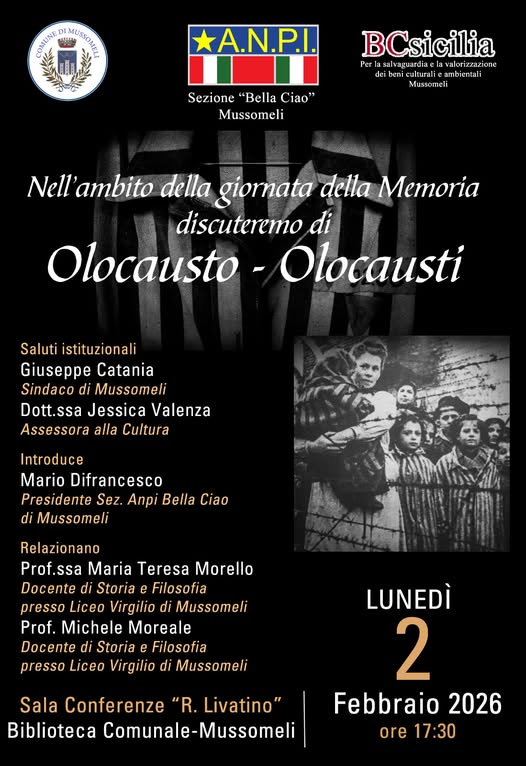 Nell’ambito della Giornata della Memoria l’ANPI di Mussomeli, diretta dal dott. Mario Di Francesco, ha organizzato “Olocausto – Olocausti” un incontro dibattito lunedì 2 febbraio alle 17,30 nella Sala “Rosario Livatino” della Biblioteca Comunale, con il patrocinio del Comune di Mussomeli e di BC Sicilia.