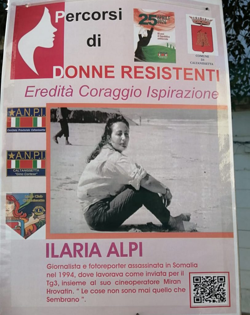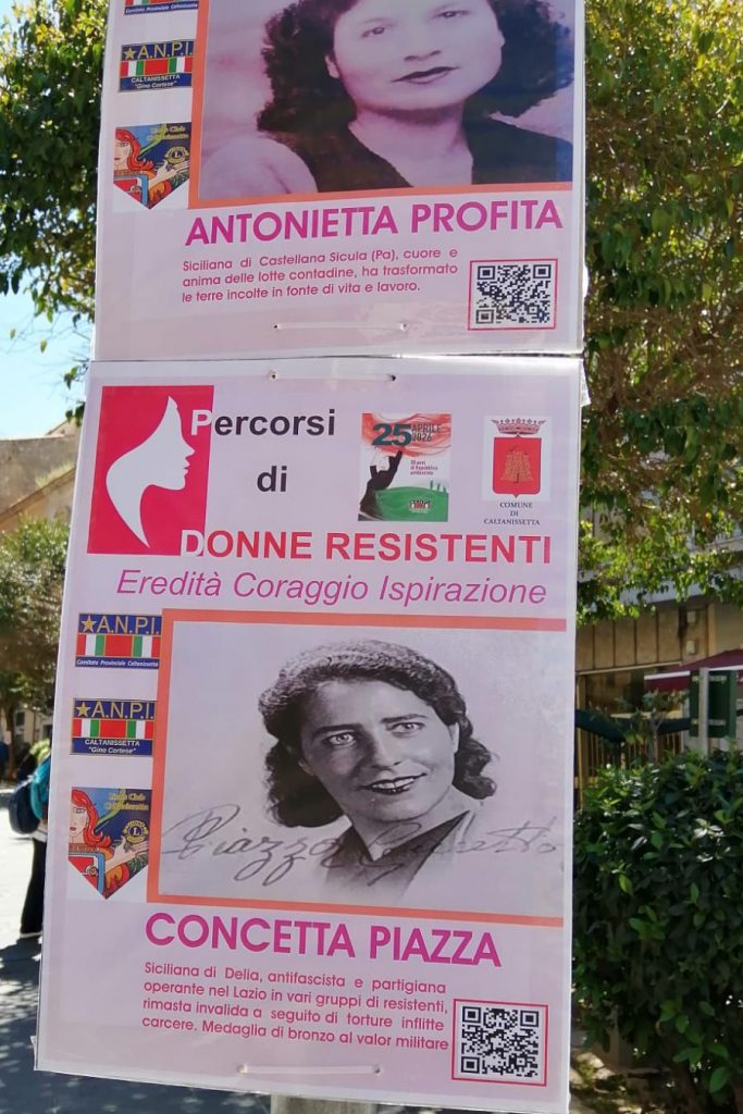 L’ANPI (Associazione Nazionale Partigiani d’Italia) ha costruito una mostra, dedicata alle donne “resistenti”, che ha voluto esporre, il 25 e il 26 aprile, nei centri storici di San Cataldo e di Caltanissetta, (con il patrocinio dei rispettivi Comuni) nelle strade principali, affidando a pannelli leggeri i volti e le storie di donne che hanno avuto il coraggio di spendersi per cambiare le cose, pagando di persona, mettendosi in discussione, scardinando poteri concreti e simbolici, diventando un esempio per tutte e tutti, tanto più efficace quanto più è stato vicino alla vita quotidiana di ciascuno/o.