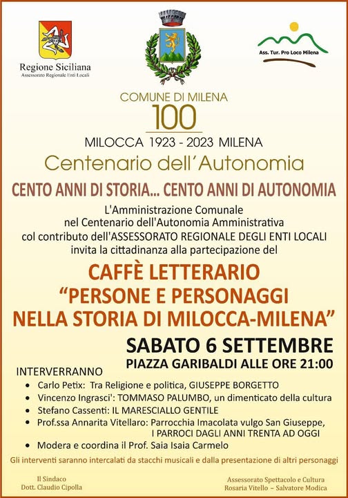Continuano le iniziative culturali per celebrare i 100 anni di autonomia del Comune di Milena, l’antica Milocca, con il “Caffè Letterario”, in piazza Garibaldi sabato 6 settembre alle 21, dedicato ad alcuni personaggi importanti nella storia della cittadina dei 13 villaggi, il “paese delle robbe”.