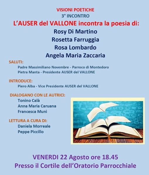 A cura dell’AUSER del Vallone, presieduta da Pietra Manta, si svolge il terzo incontro del progetto “Visioni poetiche“, a Montedoro, venerdì 22 agosto alle 18,45, nel cortile dell’Oratorio della parrocchia, che festeggia quest’anno il centenario della sua istituzione.