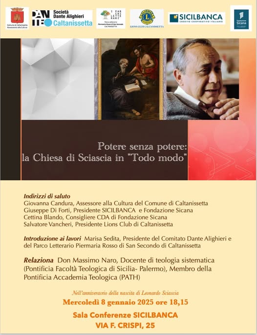 Mercoledì 8 gennaio alle 18,15 nella Sala conferenze di Sicilbanca a Caltanissetta (via Crispi, 25) un evento culturale di grande interesse. Don Massimo Naro, relazionerà sul tema: “Potere senza potere: la Chiesa di Sciascia in “Todo modo”.”