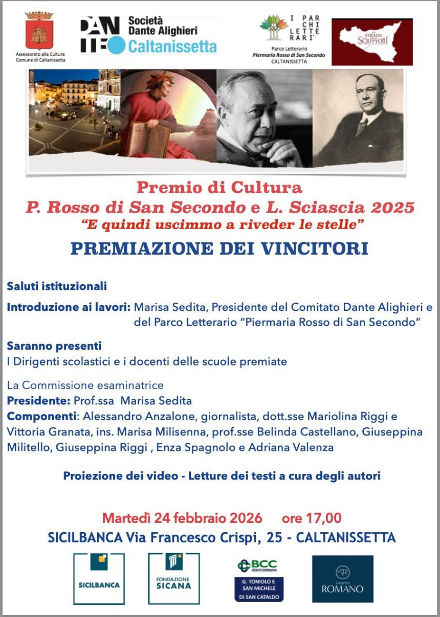 Cultura ed EventiPremio di Cultura P. Rosso di San Secondo e L. Sciascia: Premiazione il 24 febbraio ore 17 Sicilbanca Ultimo aggiornamento: Febbraio 23, 2026 4:44 pm redazione 109 Views Condividere CONDIVIDERE TAGGED:Adriana ValenzaAlessandro Anzalonebelinda castellanoEnza SpagnoloGiuseppina MilitelloGiuseppina RiggiMariolina RiggiMarisa MilisennaMarisa SeditaVittoria Granata Condividi Questo Articolo Facebook Twitter Whatsapp Whatsapp Copy Link Print