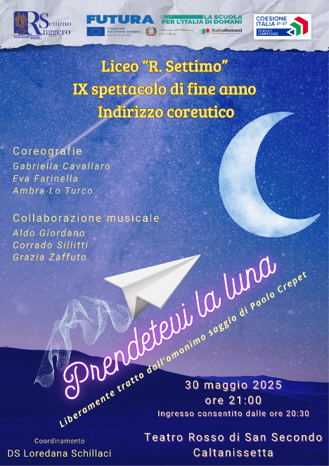 Venerdì 30 maggio, presso il teatro Rosso di San Secondo di Caltanissetta, alle ore 21.00, andrà in scena il IX spettacolo di fine anno del Liceo “Ruggero Settimo” – Indirizzo Coreutico, diretto dalla prof. Loredana Schillaci.