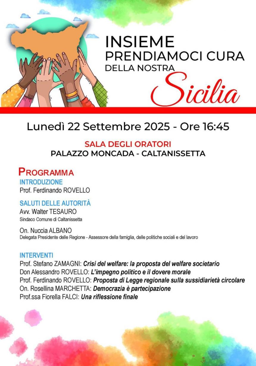 Lunedì 22 settembre, a Palazzo Moncada, Sala degli Oratori, alle 16,45 il prof. Ferdinando Rovello, autore del Disegno di Legge da presentare all’Assemblea Regionale Siciliana, sarà relatore al Convegno “Prendiamoci cura della nostra Sicilia”, insieme al prof. Stefano Zamagni (Crisi del welfare: la proposta del welfare societario), don Alessandro Rovello (L’impegno politico e il dovere morale), on. Rosellina Marchetta (Democrazia è partecipazione), prof. Fiorella Falci (Una riflessione finale). Saluti istituzionali del Sindaco avv. Walter Tesauro e dell’on. Nuccia Albano assessora regionale alla famiglia e alle politiche sociali.