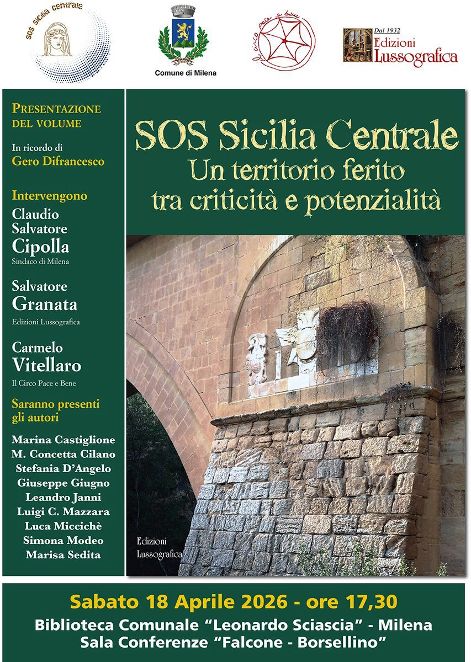 Il volume, edito da Edizioni Lussografica, dall’emblematico titolo “SOS Sicilia Centrale. Un territorio ferito. Tra criticità e potenzialità”, è stato dunque presentato a Milena, sabato 18 aprile 2026, nella sala conferenze “Falcone-Borsellino” della Biblioteca Comunale “Leonardo Sciascia”. Sono intervenuti Claudio Salvatore Cipolla – sindaco di Milena, Salvatore Granata – Edizioni Lussografica e Carmelo Vitellaro – Il Circo Pace e Bene. Presenti alcuni degli autori del volume: Marina Castiglione, Stefania D’Angelo, Leandro Janni, Luca Miccichè, Simona Modeo. L’evento è stato dedicato alla memoria di uno degli autori del volume, Gero Difrancesco, noto studioso originario di Sutera, condirettore della Rivista di Studi Storici Siciliani, recentemente scomparso.