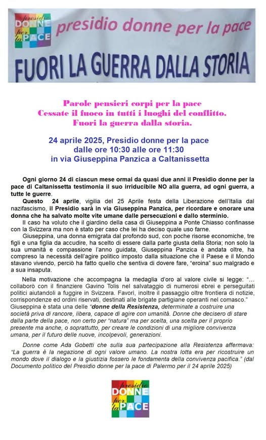 Cronaca AttualitàPresidio delle Donne per la Pace il 24 aprile alle 10,30 in via Giuseppina Panzica a Caltanissetta Ultimo aggiornamento: Aprile 22, 2025 9:33 am redazione 226 Views Condividere CONDIVIDERE Condividi Questo Articolo Facebook Twitter Whatsapp Whatsapp Copy Link Print