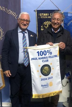 Il Governatore del Distretto 2110 Sicilia Malta, Giuseppe Pitari, alla presenza di numerose autorità Rotariane e di numerosi amici, ha consegnato al Presidente Gaetano Alù il gagliardetto Paul Harris Fellow 100% (PHF).