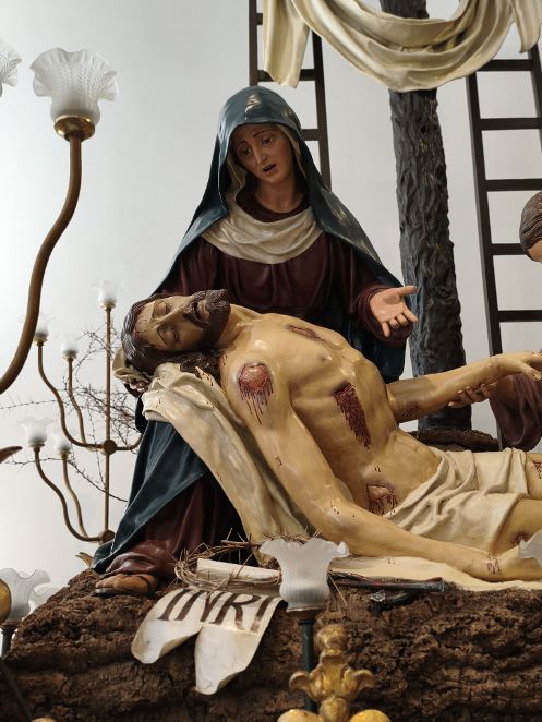 Nel 1888 arrivò invece un’opera bellissima, l’ultima vara fatta insieme da padre e figlio: la Pietà. I Biangardi realizzarono un gruppo di grande forza emotiva, che mostrava chiaramente un legame con un’opera precedente scolpita quasi trent’anni prima a Cittanova, in Calabria. La composizione era simile: il Cristo deposto, la Madre che lo sostiene nel dolore. Ma il gruppo nisseno introduceva una scelta diversa e più drammatica. Al posto dei due putti presenti nella composizione calabrese comparivano San Giovanni e la Maddalena, due figure che accentuavano la dimensione umana e partecipata della scena. Il ceto dei Borghesi investì molto in quell’opera: la realizzazione costò circa 1200 lire, cifra considerevole per l’epoca e segno della fiducia riposta nell’arte dei Biangardi.