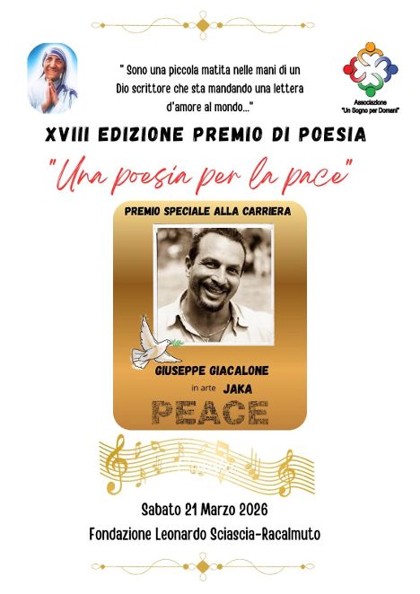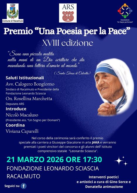 Racalmuto si prepara a vivere uno dei momenti culturali più significativi dell’anno. Infatti domani Sabato 21 marzo, alle 17:30, in occasione della Giornata Mondiale della Poesia, la Fondazione Leonardo Sciascia ospiterà la Cerimonia della XVIII edizione del Premio Nazionale “Una Poesia per la Pace”, promosso dall’Associazione Un Sogno per Domani con il patrocinio del Comune di Racalmuto e dell’ARS.