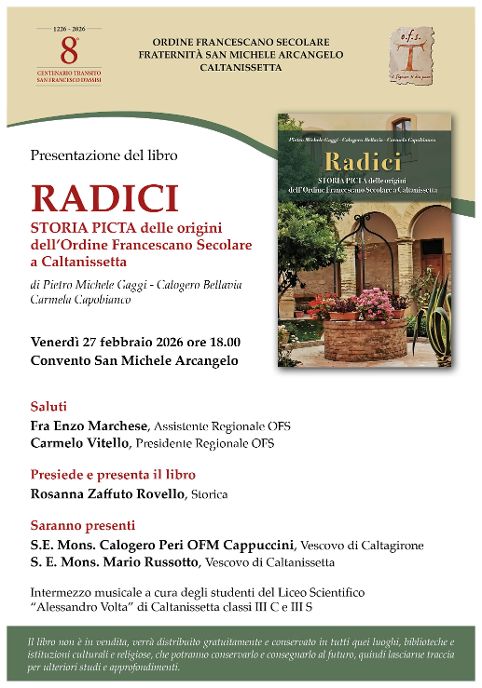 Il libro Radici, stampato a dicembre 2025 dalla Lussografica di Caltanissetta, verrà presentato dalla Prof. Rosanna Zaffuto Rovello venerdì 27 febbraio alle ore 18:00 presso il Convento San Michele Arcangelo di Caltanissetta, nell’ambito dei festeggiamenti per l’Ottavo Centenario del Transito di San Francesco d’Assisi, alla presenza del Vescovo di Caltanissetta S.E. Mons. Mario Russotto e del Vescovo di Caltagirone S. E. Mons. Calogero Peri.