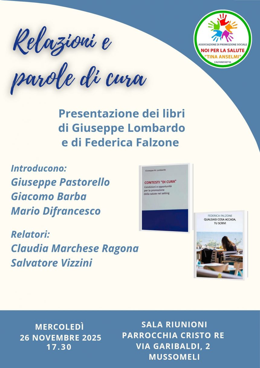 Mercoledì 26 novembre, alle 17,30, nella Sala riunioni della parrocchia Cristo Re (via Garibaldi, 2) a Mussomeli, l’Associazione “Noi per la salute – Tina Anselmi”, che promuove l’informazione sui diritti e la formazione alla prevenzione e alla cultura della salute, presenta due libri sulle relazioni di cura e il valore terapeutico della scrittura: “Contesti di cura” dello psicologo Giuseppe Lombardo e “Qualsiasi cosa accada, tu scrivi” della psicologa Federica Falzone.