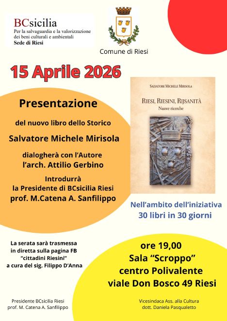 Eventi“Riesi, Riesini, Rijsanità” di Salvatore M. Mirisola si presenta a Riesi il 15 aprile Ultimo aggiornamento: Aprile 14, 2026 11:00 am redazione 52 Views Condividere CONDIVIDERE TAGGED:Attilio GerbinoDaniela PasqualettoFilippo D'AnnaMaria Catena SanfilippoSalvatore Michele Mirisola Condividi Questo Articolo Facebook Twitter Whatsapp Whatsapp Copy Link Print