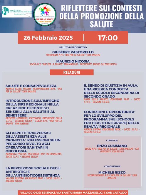 17:00. Moderatore Enzo Cusimano, socio dell’ APS “Noi per la Salute” già Dirigente Scolastico;