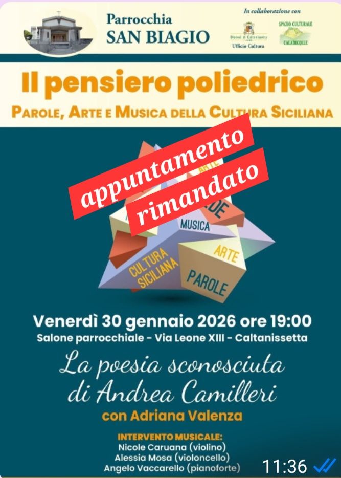 Cultura ed EventiRinviato l’incontro del “Pensiero poliedrico” per indisposizione della relatrice Ultimo aggiornamento: Gennaio 29, 2026 6:55 pm redazione 158 Views Condividere CONDIVIDERE TAGGED:Adriana Valenzagiovanna caruana Condividi Questo Articolo Facebook Twitter Whatsapp Whatsapp Copy Link Print