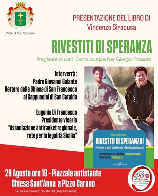 Eventi“Rivestiti di speranza” Pier Giorgio Frassati e Carlo Acutis nel nuovo libro di Vincenzo Siracusa il 29 agosto a S. Cataldo Ultimo aggiornamento: Agosto 23, 2025 12:45 pm redazione 213 Views Condividere CONDIVIDERE TAGGED:Euguenio Di FrancescoLibreria Paoline point Caltanissettapadre Giovanni GalanteVincenzo Siracusa Condividi Questo Articolo Facebook Twitter Whatsapp Whatsapp Copy Link Print