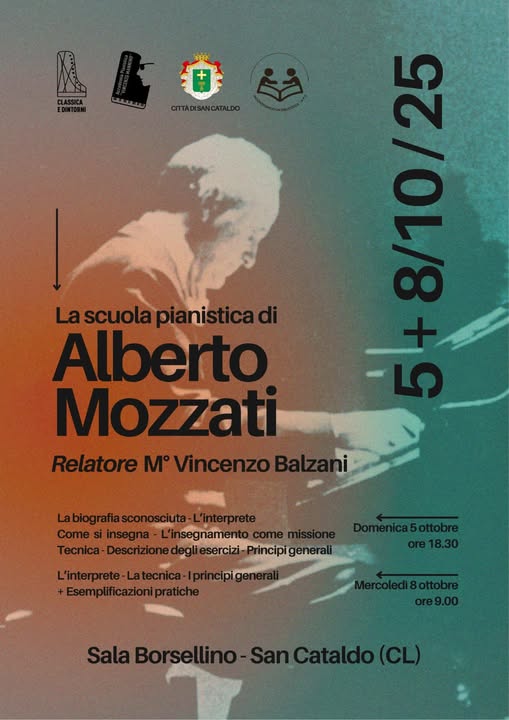 Domenica 5 ottobre alle 18,30 e mercoledì 8 ottobre alle 9, a San Cataldo nella Sala Borsellino il Vincenzo Balzani, relazionerà sulla Scuola pianistica di Alberto Mozzati (1917-1982) in due incontri che presenteranno il metodo, la tecnica e la qualità interpretativa del maestro milanese, fondatore dell’Accademia di Musica che porta il suo nome.