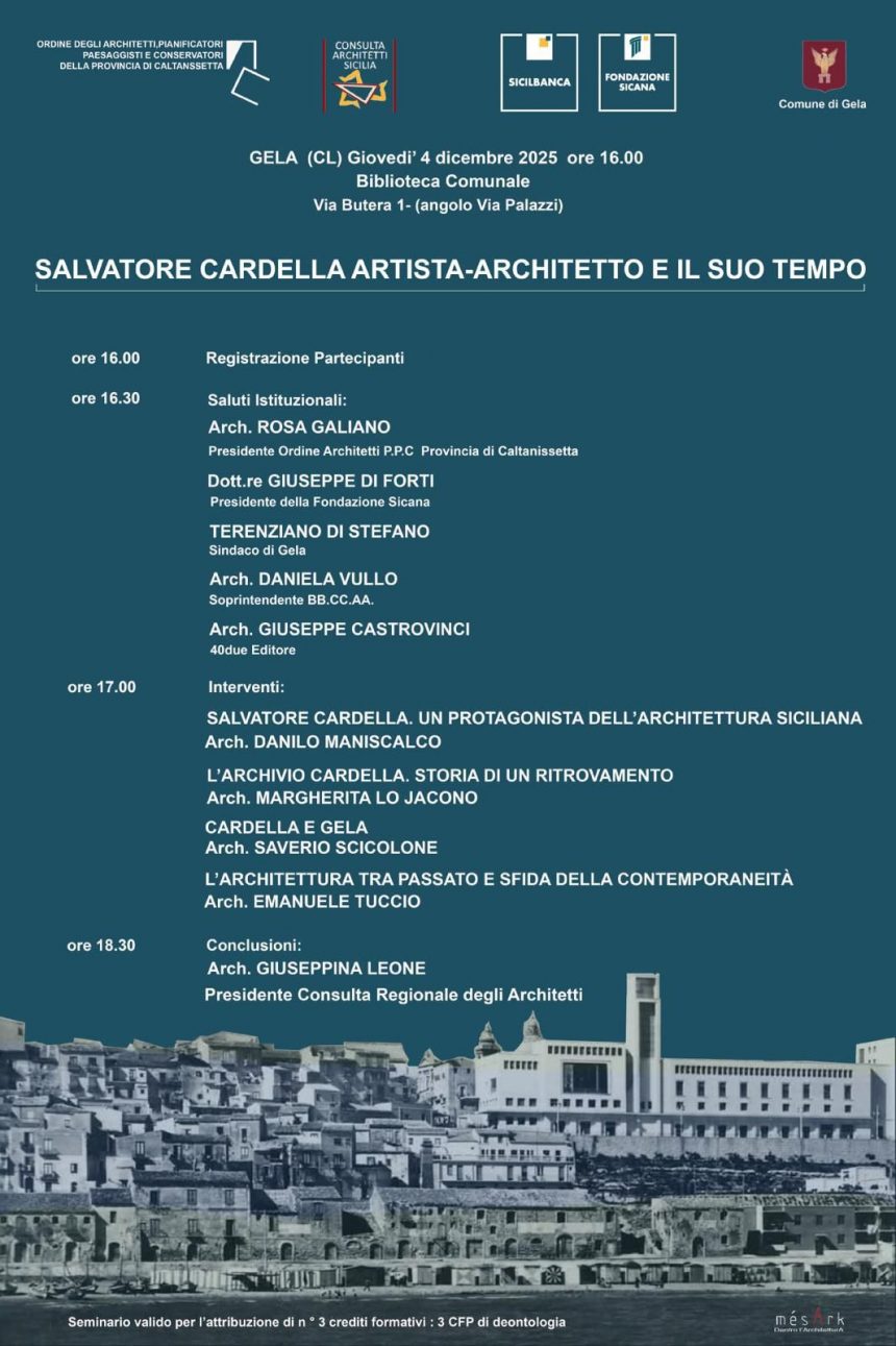 La figura e l’opera del grande architetto nisseno Salvatore Cardella sarà al centro di un convegno di studi a Gela, città in cui sono presenti importanti testimonianze della sua genialità progettuale: giovedì prossimo, 4 dicembre, dalle 16,30, nella Biblioteca Comunale, promosso dall‘Ordine degli Architetti della provincia di Caltanissetta, dalla Consulta Regionale degli Architetti, dal Comune di Gela, da Sicilbanca e dalla Fondazione Sicana.