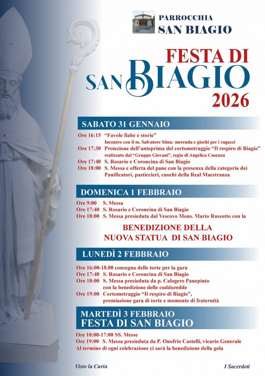 Domenica 1° febbraio la S. Messa delle 18.00 sarà presieduta dal Vescovo Mons. Mario Russotto e si concluderà con la benedizione della nuova statua di San Biagio, offerta alla parrocchia dalla famiglia di Gaetano e Maria Concetta Angilella.