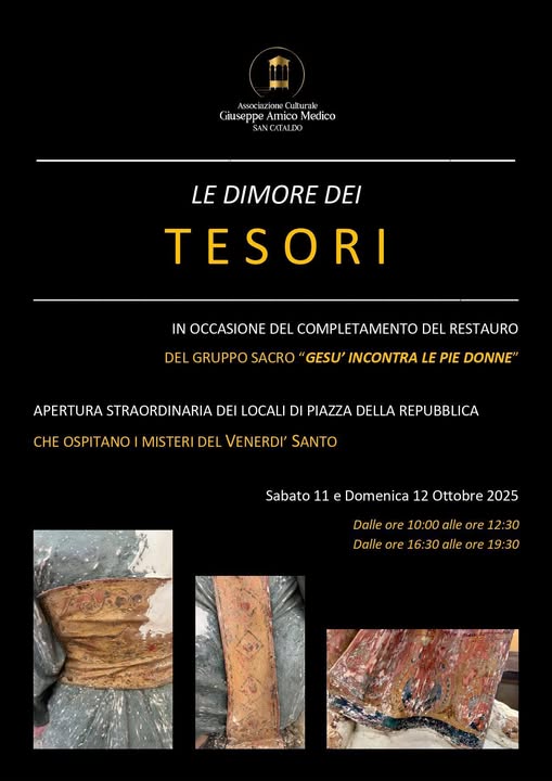 “Restaurare per restituire”, con questo messaggio l’associazione culturale Giuseppe Amico Medico ha voluto lanciare l’apertura straordinaria della sede di piazza della Repubblica a San Cataldo, l’11 e il 12 ottobre, dove sarà possibile ammirare, oltre alle altre Vare del Venerdì Santo, il gruppo sacro “Gesù incontra le Pie Donne”, oggetto di un intervento di restauro.
