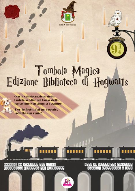 Il secondo evento, la “Tombola Magica Edizione Biblioteca di Hogwarts,” si terrà mercoledì 30 dicembre alle ore 17:00 presso la Biblioteca Comunale B. Giuliana. Questo evento è ispirato alla biblioteca di Hogwarts, il famoso istituto di magia dal mondo di Harry Potter, e promette una tombola magica piena di sorprese e premi. Questa edizione speciale della Tombola Magica promette un’esperienza unica, con attività che spaziano dalla raccolta di fondi per cause benefiche alla possibilità di scattare foto su sfondo con cuccioli, aggiungendo un tocco di dolcezza e magia all’evento. I partecipanti potranno anche godere di animazione a tema, immergendosi completamente nell’universo di Hogwarts. Questo evento è perfetto per i lovers di Harry Potter e per tutti coloro che amano la magia e i libri.