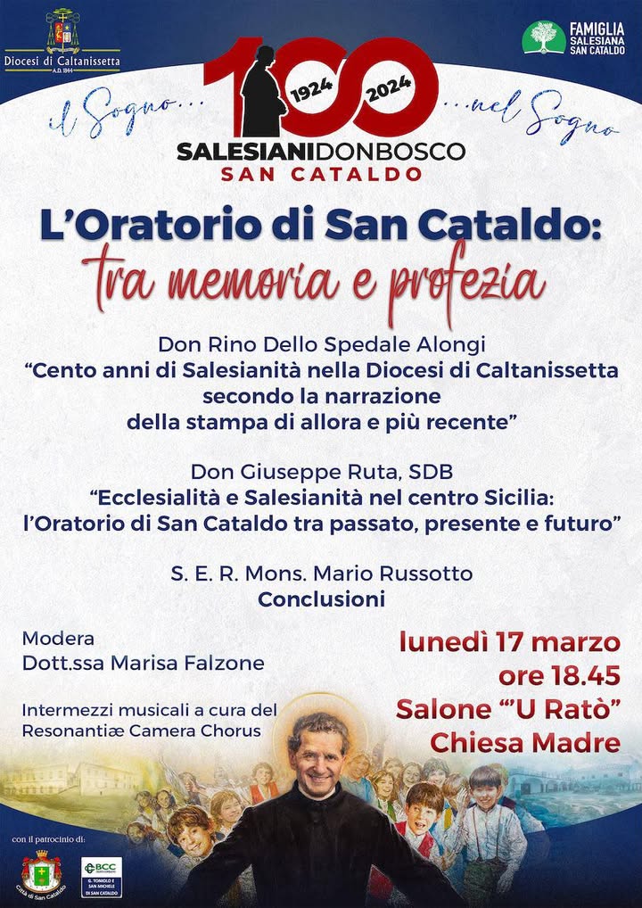 100 anni di presenza salesiana a San Cataldo e nella Diocesi di Caltanissetta: memoria storica, presente e prospettive future nella riflessione di padre Rino Dello Spedale Alongi e don Giuseppe Ruta. Conclusioni del vescovo mons. Mario Russotto. Moderatrice la dott. Marisa Falzone.