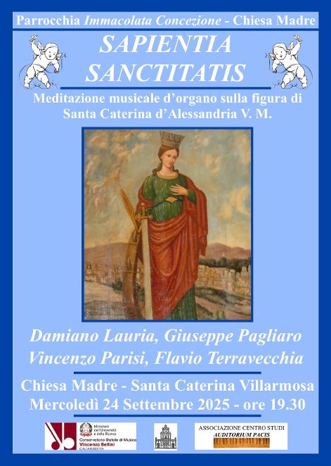 Mercoledì 24 settembre 2025 alle ore 19.30 in Chiesa Madre a Santa Caterina Villarmosa si svolgerà l’evento Sapientia Sanctitatis, una meditazione musicale d’organo sulla figura di Santa Caterina d’Alessandria.