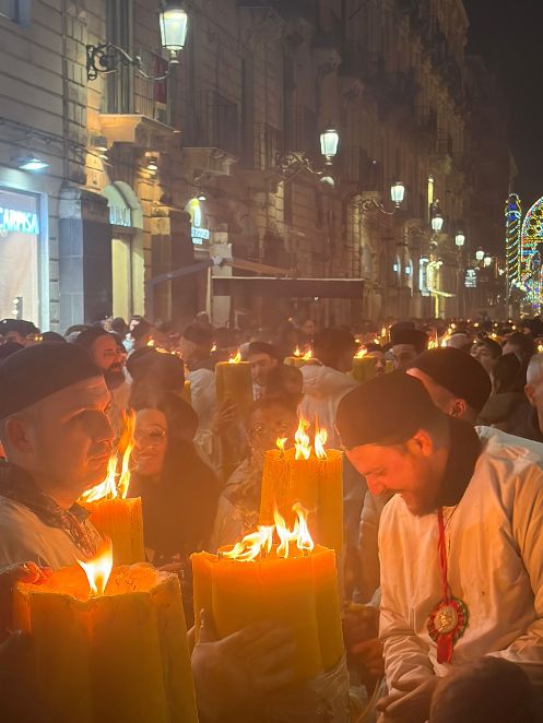 Le candelore hanno preso parte regolarmente alla processione del 5 febbraio. Una processione intensa, commovente, segnata dalla presenza di uomini in sacco bianco che portano sulle spalle ceri accesi, enormi, pesanti come macigni. Nel silenzio improvviso, capita di sentire grida laceranti: preghiere che diventano urla verso il cielo. Storie di incidenti, guarigioni, perdite troppo grandi. Si grida per farsi sentire dalla Santa, ma anche per testimoniare. È un intreccio continuo di singhiozzi strozzati.