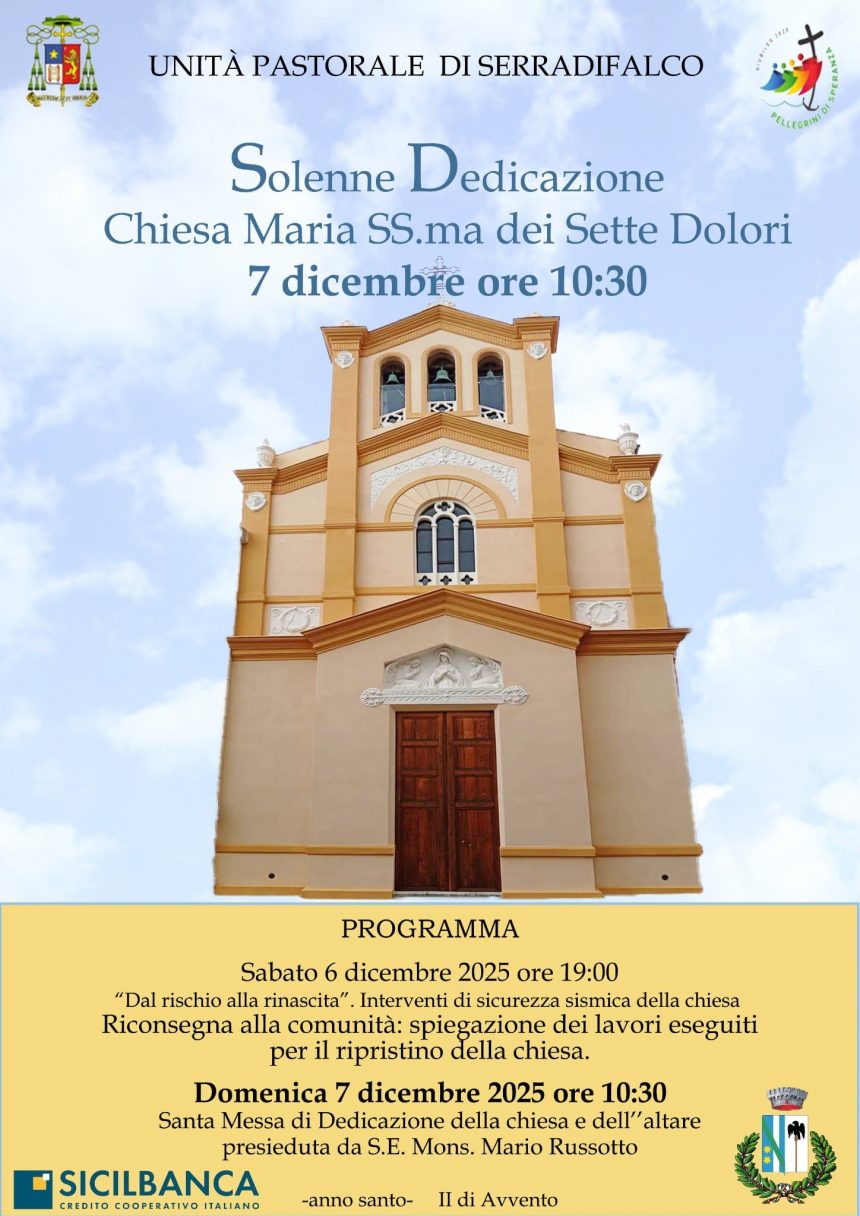 L’Unità pastorale di Serradifalco, annuncia con gioia e gratitudine la riapertura e solenne Dedicazione della Chiesa Maria Ss. dei Sette Dolori (al Collegio di Maria), restituita alla comunità dopo importanti interventi di messa in sicurezza sismica e restauro.