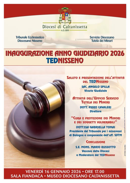 Venerdì 16 gennaio, alle ore 17, nella Sala Fiandaca del Museo Diocesano, inaugurazione dell’anno giudiziario 2026 del Tribunale Ecclesiastico Diocesano (TED), di cui è Moderatore il Vescovo Mons. Mario Russotto e Vicario Giudiziale padre Angelo Spilla, che svolgerà la relazione introduttiva sull’attività che è stata svolta nell’anno 2025 appena trascorso, evidenziandone gli elementi di maggiore rilievo.