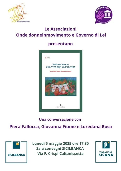 Con una conversazione tra Loredana Rosa, Piera Fallucca e Giovanna Fiume sarà presentato il libro “Simona Mafai, una vita per la politica” lunedì 5 maggio alle 17,30 nella Sala Convegni di Sicilbanca (via Crispi) a Caltanissetta, a cura delle associazioni “Governo di Lei” e “Onde Donneinmovimento”.