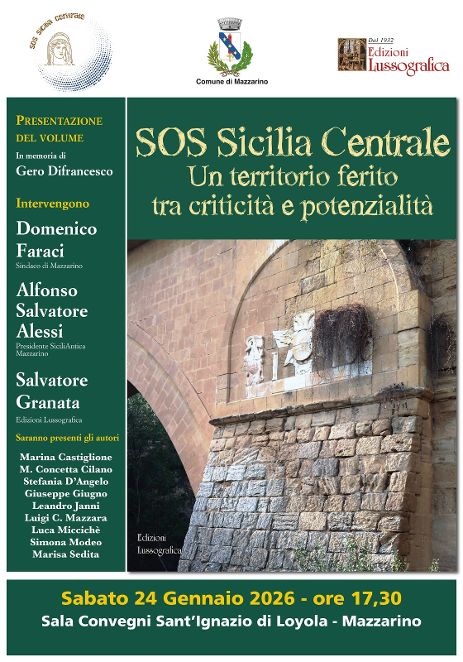 Il volume, edito da Edizioni Lussografica, dall’emblematico titolo “SOS Sicilia Centrale. Un territorio ferito. Tra criticità e potenzialità”, sarà presentato a Mazzarino sabato 24 gennaio, alle ore 17,30, presso la Sala Convegni Sant’Ignazio di Loyola.