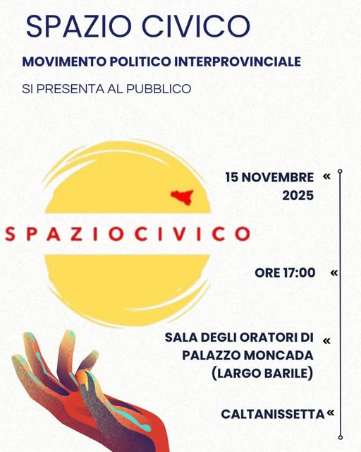 Cronaca AttualitàSpazio Civico, la nuova aggregazione di movimenti civici si presenta a Caltanissetta sabato 15 novembre a Palazzo Moncada Ultimo aggiornamento: Novembre 14, 2025 7:54 am redazione 177 Views Condividere CONDIVIDERE Condividi Questo Articolo Facebook Twitter Whatsapp Whatsapp Copy Link Print
