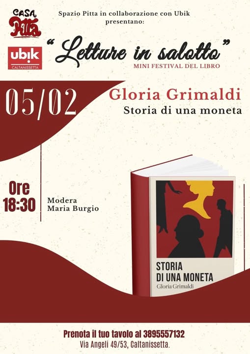 5 febbraio alle 18:30 appuntamento allo SPAZIO PITTA per la presentazione del libro STORIA DI UNA MONETA con l’autrice esordiente nissena Gloria Grimaldi, intervistata da Maria Burgio. Posti limitati, occorre prenotare al numero in locandina