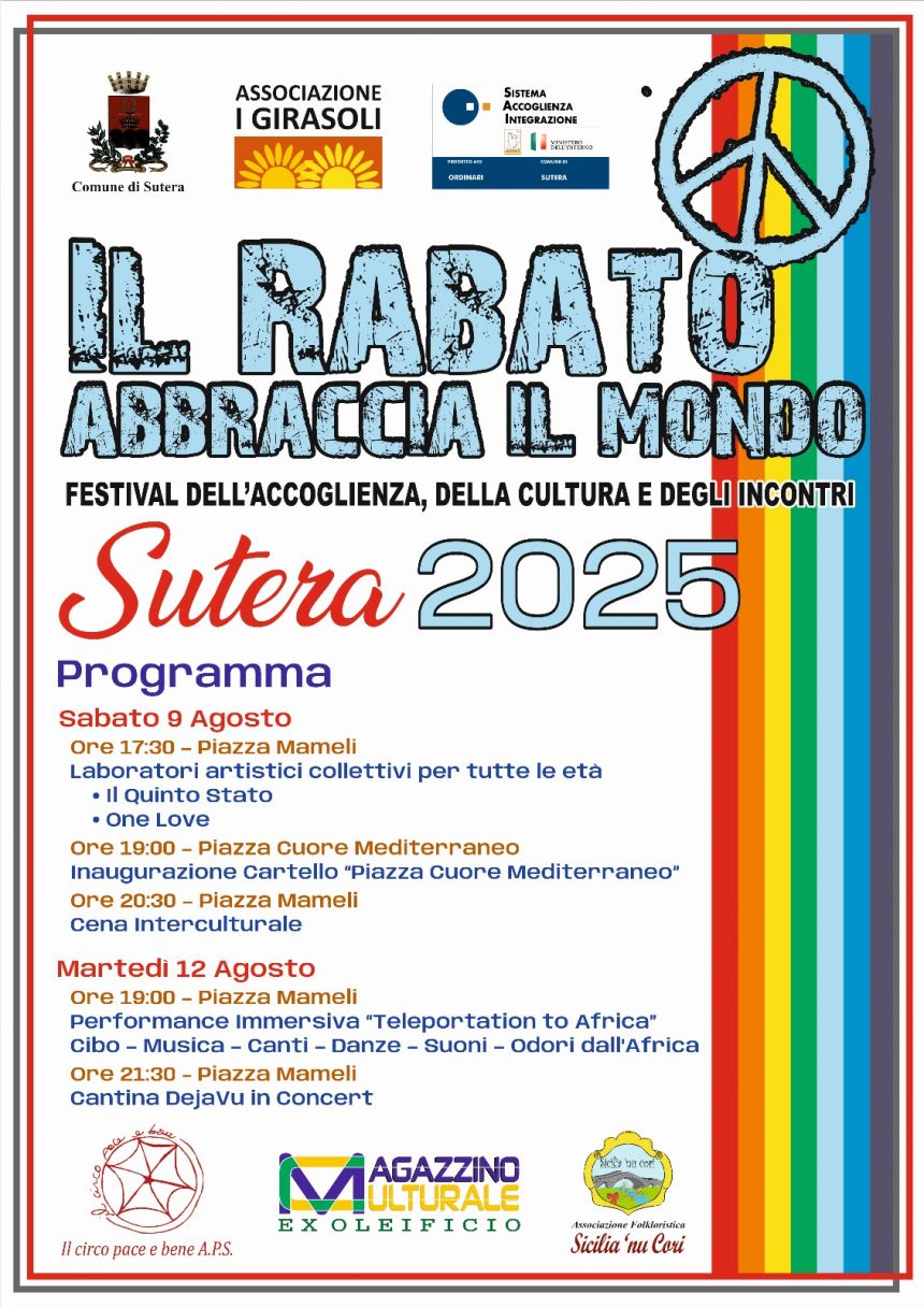 EventiHinterlandSutera 9-12 agosto: “Il Rabato abbraccia il mondo” Festival dell’accoglienza, della cultura e degli incontri Ultimo aggiornamento: Agosto 7, 2025 3:59 pm redazione 319 Views Condividere CONDIVIDERE Condividi Questo Articolo Facebook Twitter Whatsapp Whatsapp Copy Link Print