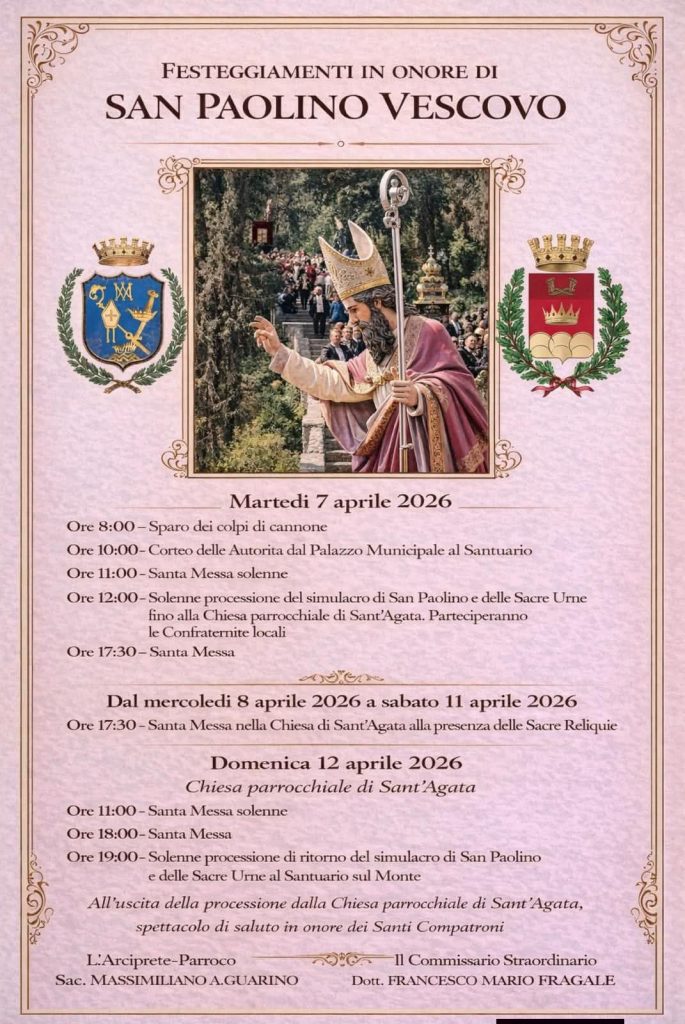 E’ questo il contesto in cui si svolgono le sei giornate di preghiera e celebrazioni, dal 7 al 12 aprile, dedicate al Patrono San Paolino, di cui la chiesa di Sant’Agata ospita le reliquie.