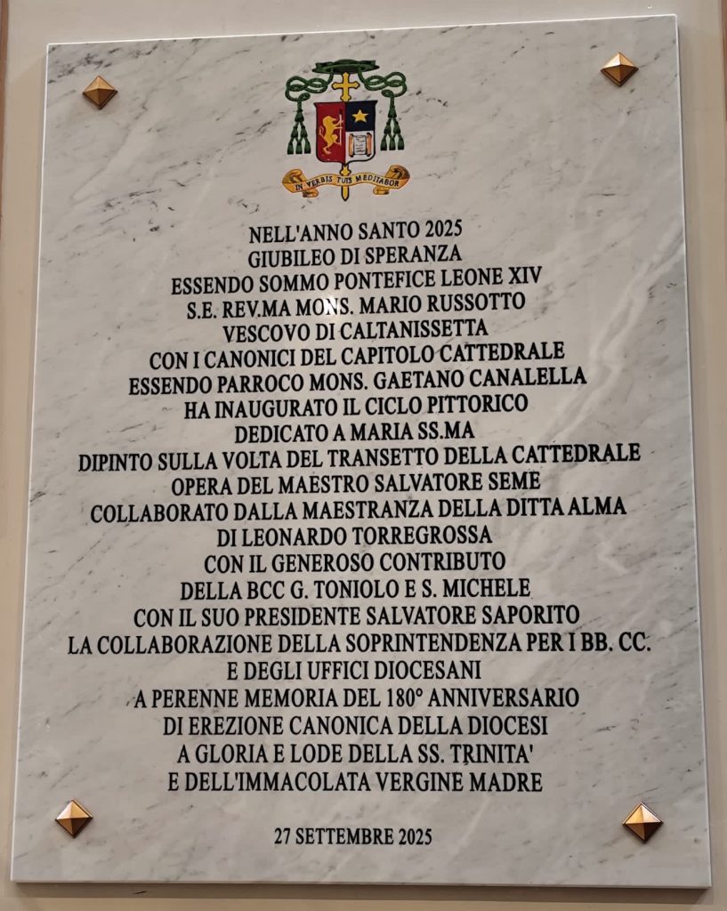 Giornata storica il 27 settembre, per la cattedrale di Caltanissetta, per la diocesi e per tutta la città: “svelati” gli affreschi sulle volte del transetto, ciclo pittorico dedicato a Maria, opera dell’artista campano Salvatore Seme, che è riuscito a realizzare un’opera estremamente impegnativa, confrontandosi, con coraggio e grande umiltà, con gli affreschi del Borremans, che dal 1732 decorano la volta della navata centrale, e con quelli di Nicola Arduino, che nell’immediato dopoguerra li restaurò e dipinse ex novo, sul catino absidale appena completato, la scena solenne della Pentecoste.