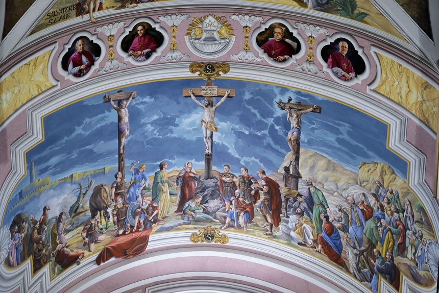 Al centro delle tre sezioni una fascia con i medaglioni dei ritratti degli otto vescovi che si sono succeduti alla guida della diocesi nei 180 anni della sua storia, a incardinare nella storia della Chiesa locale la maestosità dell’iconografia, mai fine a se stessa. Fra i ritratti ci sono anche le insegne episcopali: la mitria, la croce e il pastorale, e sulla mitria è stata dipinta l’Ave Maria, “come a sottolineare che il ministero del vostro vescovo e il destino del nostro popolo è nelle mani di Maria, l’insegna della Madonna, che ispira, conduce, incoraggia, sospinge i pastori di questa diocesi e con essi tutto il popolo di Dio” ha spiegato il Vescovo Mario nella sua omelia.