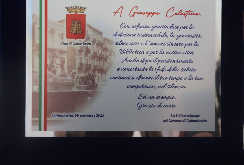 Si è tenuta questa mattina, presso i locali della biblioteca comunale “Luciano Scarabelli”, una cerimonia celebrativa dedicata a Giuseppe Celestino, che ha prestato per tanti anni il proprio servizio presso lo stesso luogo di cultura del centro storico nisseno.