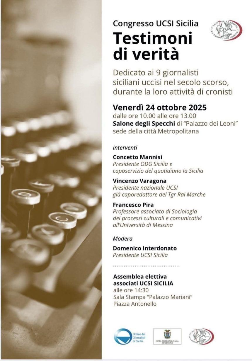 Testimoni di verità” è questo il tema del Congresso regionale dell’UCSI (Unione Cattolica Stampa Italiana), in programma venerdì 24 ottobre alle 10 a Messina nel salone degli specchi di “Palazzo dei Leoni” sede della Città Metropolitana, che sarà dedicato ai nove giornalisti siciliani uccisi dalla mafia e dalla criminalità.