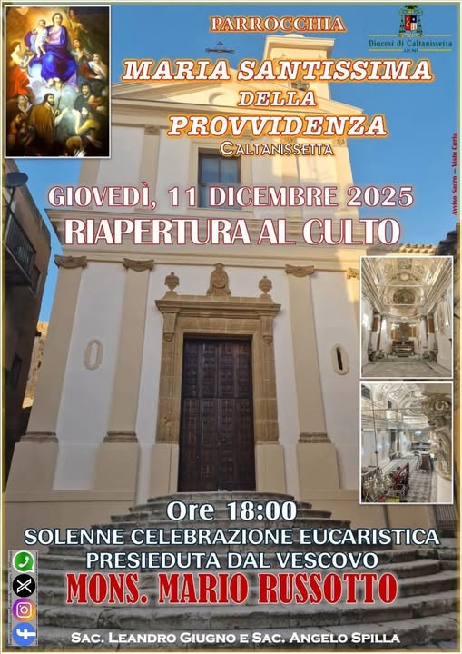 Ritorna a vivere, nel cuore del centro storico di Caltanissetta, la chiesa della Provvidenza, che, dopo anni di chiusura e poi, finalmente, di restauri, riapre al culto con una solenne celebrazione presieduta dal Vescovo mons. Mario Russotto, alle ore 18 di giovedì 11 dicembre.