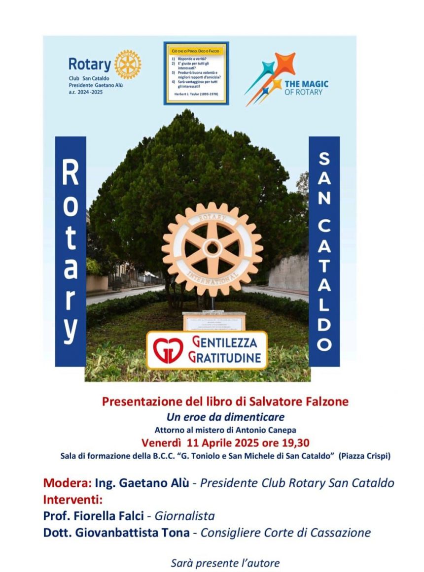 L’evento è stato promosso dal Rotary Club di San Cataldo, presieduto dall’ing. Gaetano Alù che introdurrà l’incontro. Insieme all’autore interverranno il dott. Giovanbattista Tona, Consigliere della Corte di Cassazione e Fiorella Falci, giornalista e docente di storia