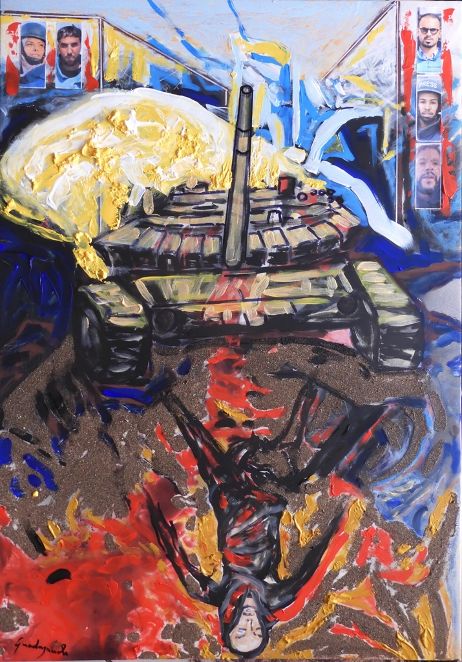 La scena domina l’occhio dello spettatore: un carro armato minaccioso che sfonda l’orizzonte sabbioso di Gaza. La lente prospettica lo fa avanzare quasi in spinta, come se stesse per uscire dalla tela e spalancare il suo orrore nella stanza.