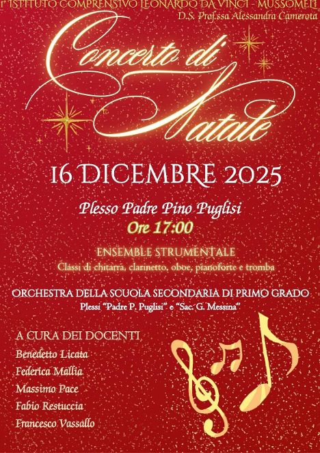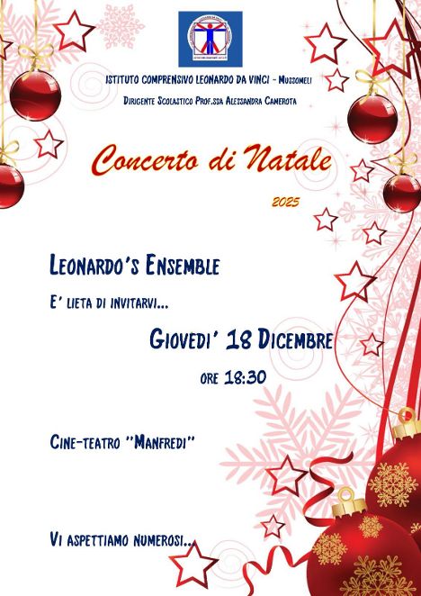 Giovedì 18 dicembre, alle ore 18:30, presso il cinema-teatro “Manfredi”, si è tenuto il “Concerto di Natale 2025”, con l’esibizione della “Leonardo’s Ensemble”, l’orchestra degli alunni della scuola secondaria di primo grado del plesso “Centrale” “Leonardo da Vinci” che hanno eseguito un suggestivo repertorio musicale, a cura dei docenti di strumento musicale. In alcuni brani si sono aggiunti con i flauti e in coro i ragazzi delle classi quinte della scuola primaria di via Madonna di Fatima.