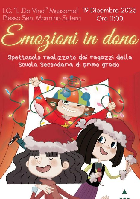 Lo stesso venerdì 19, al plesso “Sen. G. Mormino” di Sutera, alle ore 9:30 è stato presentato dalla scuola primaria uno spettacolo natalizio “Il calendario dell’avvento”, con canti, riflessioni e balletto che hanno raccontato ogni singola giornata evidenziando, volta per volta,  i valori di amicizia, pace, amore, fraternità; alle ore 11:00, gli alunni della scuola secondaria di primo grado hanno realizzato la performance “Emozioni in dono” per augurare un buon Natale con “le emozioni, i sentimenti e i veri valori umani, in un’epoca cinica e frettolosa che sembra avere dimenticato cosa significa “essere umani”, sperimentando ciò che ci costituisce con sincera e reale dignità umana”.