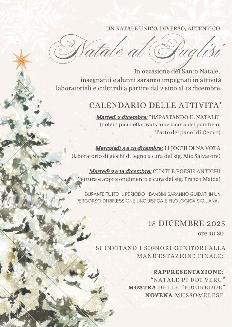 Al plesso “Padre Pino Puglisi”, gli insegnanti della scuola primaria si sono riproposti di affrontare un percorso volto alla valorizzazione delle tradizioni e del patrimonio culturale immateriale del nostro territorio: ⁠il 2 dicembre “Impastando il Natale”, “I dolci dei nostri nonni (alla scoperta della storia e della tradizione culinaria che ci sta dietro), a cura del panificio “l’arte del pane” di Genco; il 3 e 10 dicembre ⁠I giocattoli di ieri, “li jochi di na vota”, laboratori di giochi di legno a cura di Salvatore Alio; 9 e 16 dicembre “cunti e poesie antichi”, “li cunti” di nonno Franco (lettura ed approfondimento a cura di Franco Maida); il 18 dicembre, alle ore 10,30, i genitori sono stati invitati alla manifestazione finale: rappresentazione “Natale pi ddi veru”, mostra delle “figuredde” e novena mussomelese.